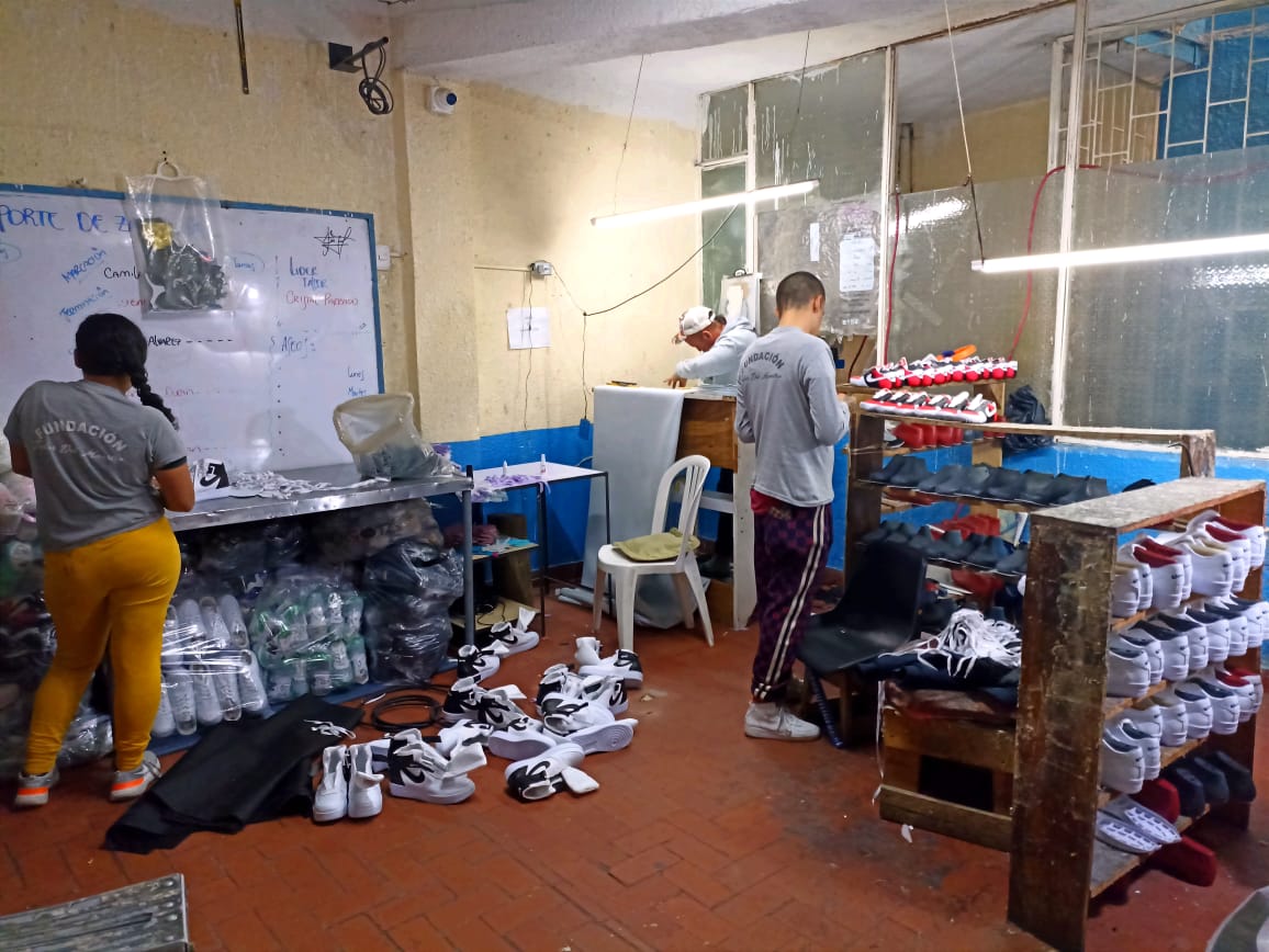 - Ensamblaje de partes y costura de zapatos.